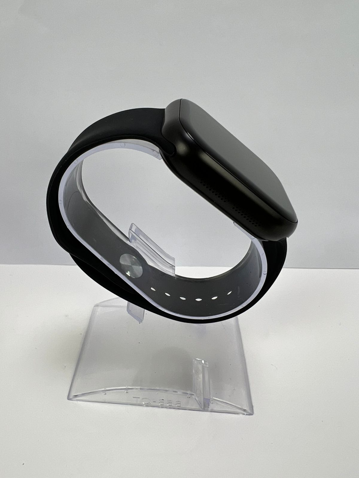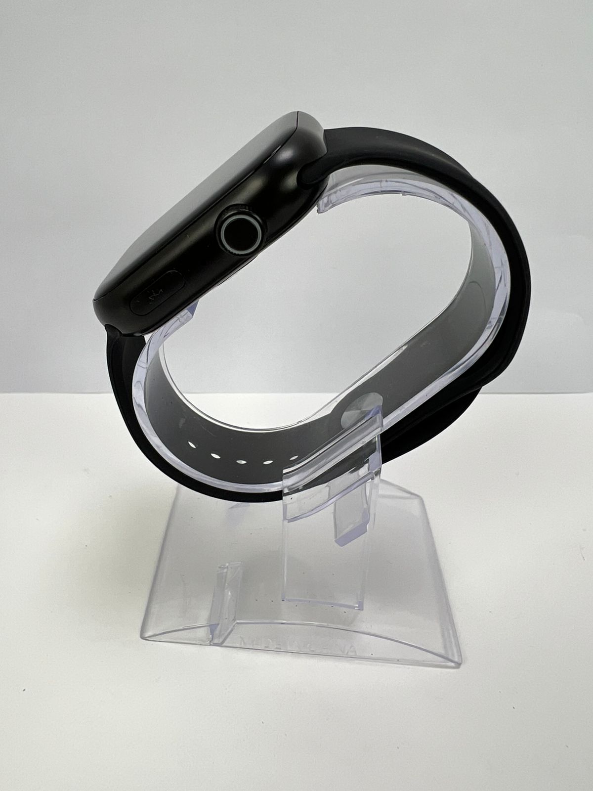 Cuerpo de reloj negro con botón lateral.