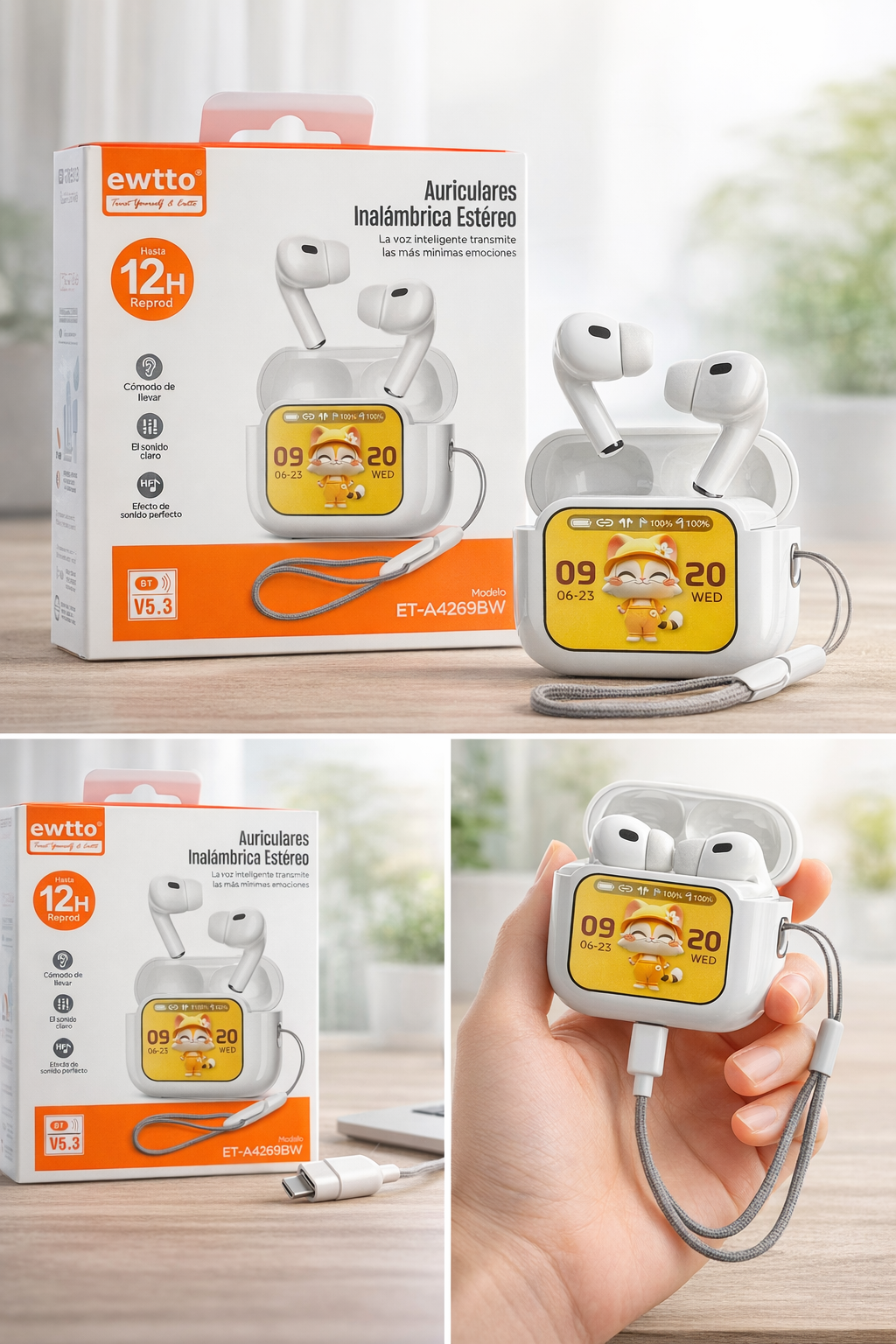 Disfrutá de un sonido claro y moderno con los audífonos inalámbricos EWTTO, diseñados para acompañarte todo el día. Su estuche con pantalla digital a color le da un toque único, mostrando información útil mientras protegés y cargás tus audífonos.